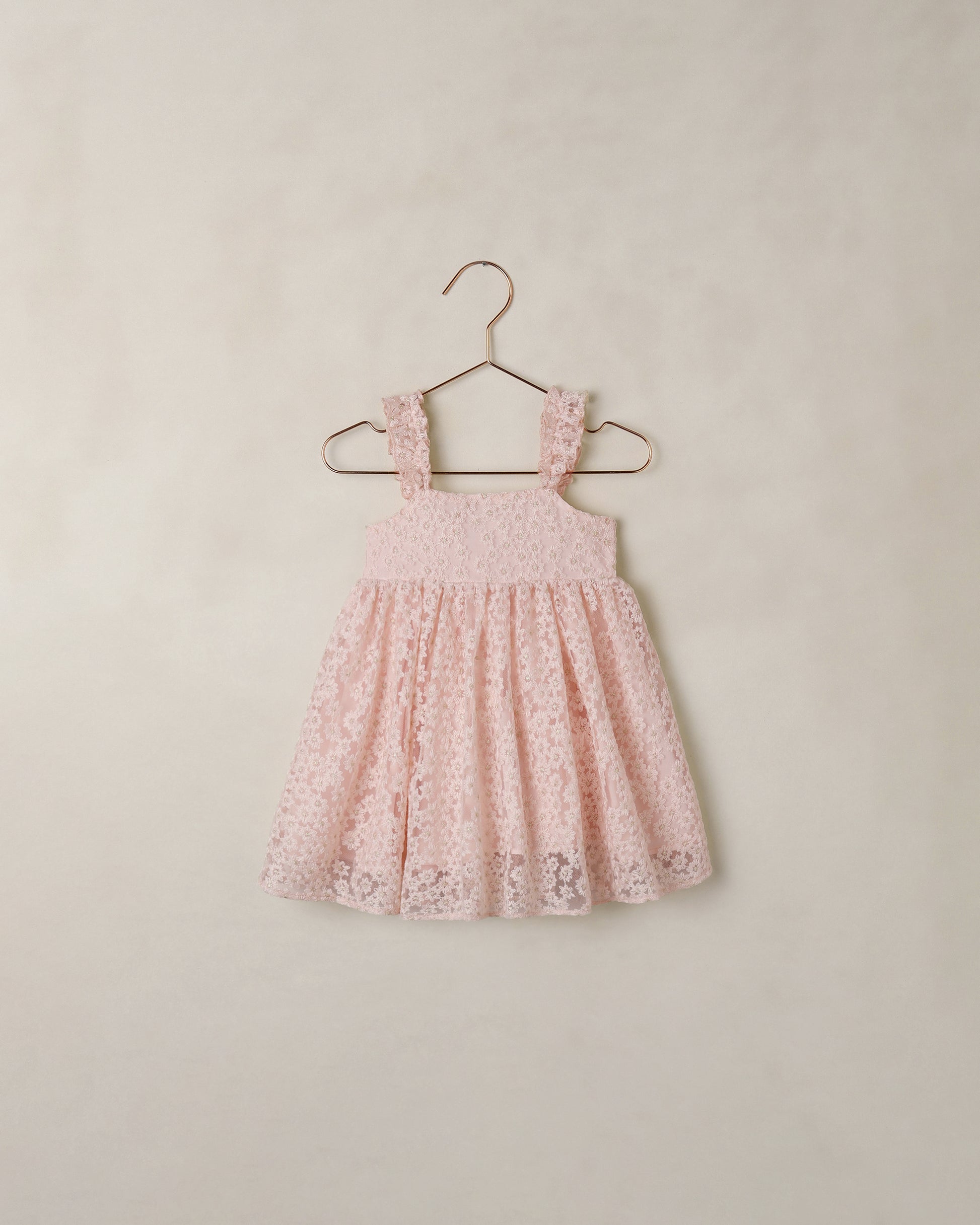 An empire-waisted Mara Dress has a full gathered skirt, elastic ruffle straps, a smocked back bodice, and a soft viscose liner.